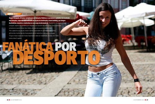 Raquel Sampaio, 29 anos, é professora de Relações Públicas e a produtora artística da Academai das Emoções, empresa espeializada em acções de motivação e team building, que integra ilusionistas, maestros e bailarinas no seu corpo de formadores. “Ajudamos um grupo a chegar a equipa”, explica esta fanática por desporto, que durante seis anos correu com a camisola amarela do Jovens Unidos Num Ideal, um clube da sua terra (Guimarães). “Foi o atletismo que me fez crescer. Ganhei capacidade de sofrimento e disciplina”, afirma esta mulher que faz musculação e já foi bailarina e instrutora de fitness. “O que o nosso corpo diz é muito importante e deve ser trabalhado. O corpo fala tanto como a boca”, explica