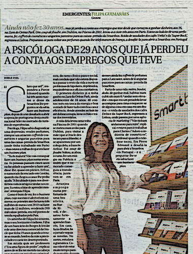 Ainda não fez 30 anos, mas já perdeu a conta aos empregos que teve, desde que começou a ganhar dinheiro, aos 16 anos, na Zara do Oeiras Shopping. Um coup de foudre , em Dublin, na Páscoa de 2001, levou-a a viver três anos em Paris. Esteve ao balcão de uma perfumaria, fez coffrets de cosméticos, e angariou parceiros para as caixa prenda da Smartbox. Roída de saudades dos cafés Delta e da Super Bock, regressou a Lisboa. Preparava-se para voltar aos perfumes, quando lhe telefonaram de França, a desafiá-la a abrir a Smartbox em Portugal
